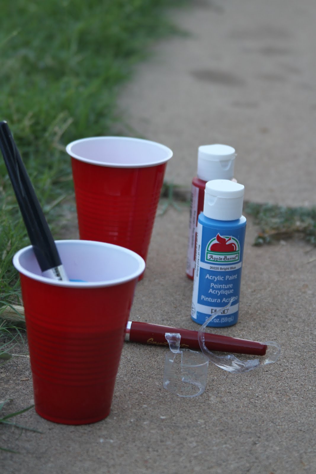 Once the shirts were dry, we took the shirts outside in the grass to paint with the watered down acrylic paints (I put the water in the cups and just a little bit of paint mixed in went a long way!)